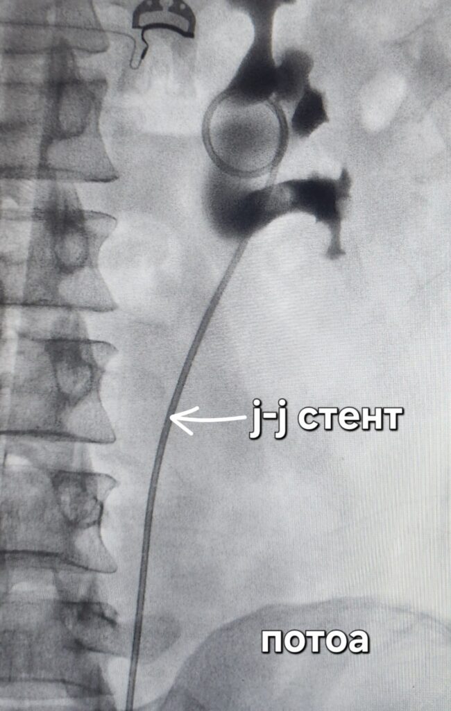 Потоа се поставува хидрофилна жица, односно жица тенка колку влакно од коса за да може да ги надмине сите опструкции по патот, а воедно да не направи повреда по самите мочни патишта. Потоа по патот на жицата се поставува џеј-џеј стентот. Зафатот трае меѓу 30 минути и 1 час. По завршената интервенција пациентот си заминува дома.