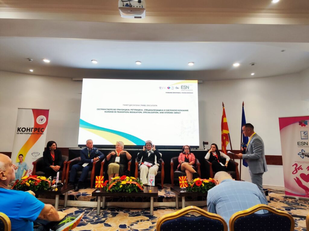 По инспиративните воведни обраќања од претставниците на ESNO, IFNA и Здружението на медицински сестри, акушерки и техничари на Македонија, следеше динамична панел дискусија на тема „Сестринство во транзиција: Регулација, Специјализација и Системско влијание“, модерирана од претседателот на ESNO – д-р Адријано Фригановиќ.