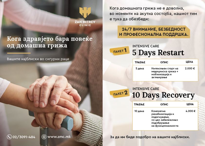 *Рестарт пакет – 5 дена интензивна нега со физиотерапевтска рехбилитација која опфаќа медицинска грижа, мобилизација и активирање (122 000 ден.)